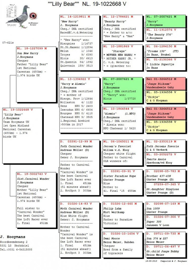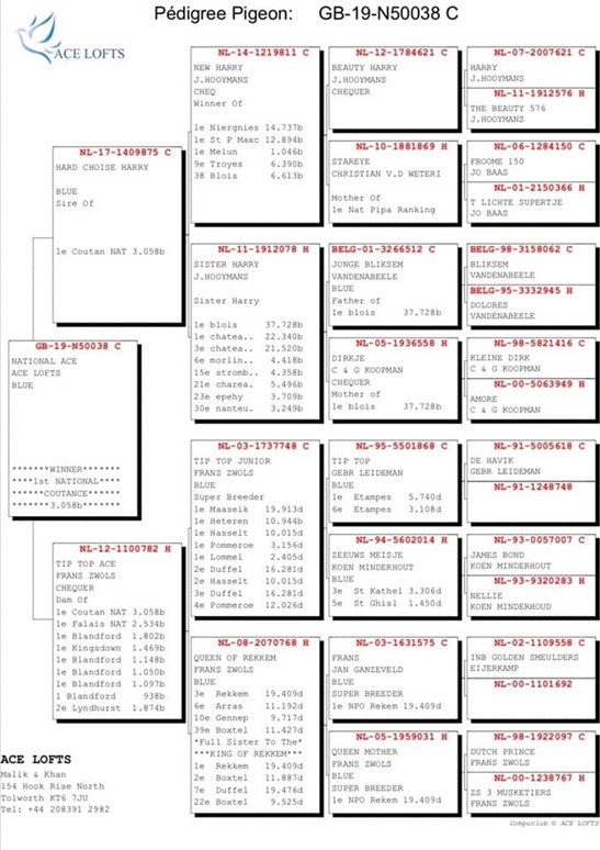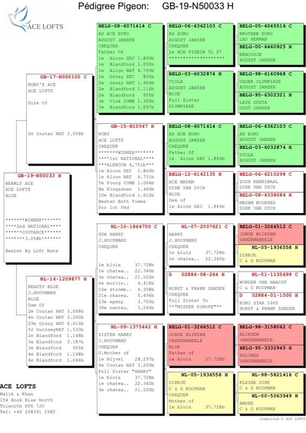 如同我們說過的,約翰憑藉“新哈利”的孫代(莉莉熊)獲得卡郎唐全國冠軍。此前一周我們看到鴿王鴿舍(Ace Loft,Khan & Malik)獲得庫唐斯(Coutances)全國300公里冠軍和亞軍,憑藉幼鴿在英國。這羽全國冠軍也是“新哈利”的孫代。全國亞軍也同樣出自胡曼斯血統鴿。