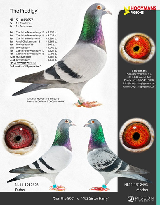 冠軍鴿為約翰戰隊超級賽鴿“普羅帝吉”的子代,現在也被證明是一羽優秀種鴿。“普羅帝吉”是“奧林匹克楊”的全兄弟,而“奧林匹克楊”也出自“800直子”X“哈利姐妹”。