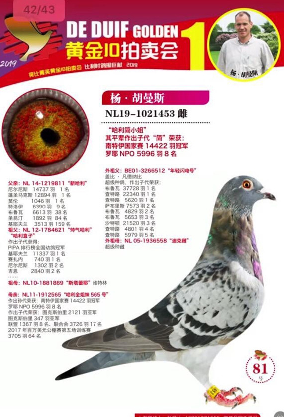 荷蘭胡曼斯ㄧ只「新哈利」NL14-1219811斑公的女兒,白紙幼鴿,NL19-1021453 斑.黃眼.母,今晚在歐洲現場拍賣拍了12.2萬歐元,還要加2成的稅;打破胡曼斯自己10年前現場拍賣哈利全妹9.8萬歐元的記錄!
