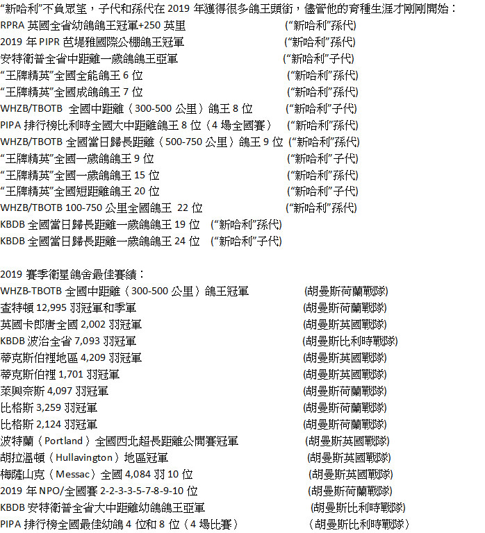 PIPA排行榜最佳幼鴿4位是NL19-1022114。父親出自“哈利”X胡曼斯的NPO查特路冠軍“阿莉茜婭”(Alexia)。母親“妮基”(Nikkie)是雅克.德容(Jarco de Jong)的2018年NPO奧爾良冠軍,出自克裡斯坦.範德維特令(Christian van de Wetering)的“灰勇敢號”(Blue Brave)直女。PIPA排行榜最佳幼鴿8位、KBDB全國中小距離鴿王冠軍和中長距離鴿王19位獲得者是“新哈利”的另外一羽孫代鴿:NL19-1022203。
