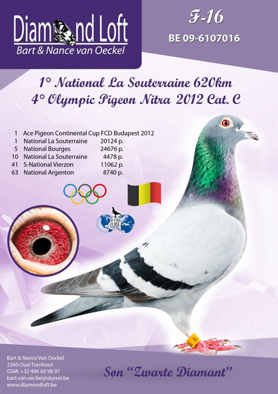 現在巴特和南茜.范歐克的鴿系收藏中有“F16”的4羽寶貴後代,根據年齡排序依次為:“萊邦納鑽石”(Libourne Diamantje BE14-6030417)、“匈牙利鑽石”(Hungary Diamant BE15-6059450)、“鴿王鑽石”(Ace Diamant BE16-6056001)和“阿爾伯托鑽石”(Alberto Diamant BE16-6056083)。