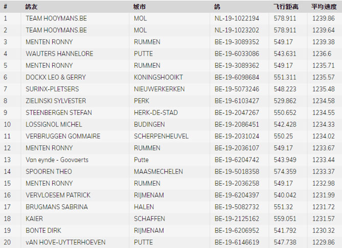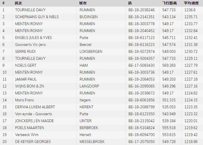 2020年比利時亞精頓 I全國(成鴿16.762羽)的成績表