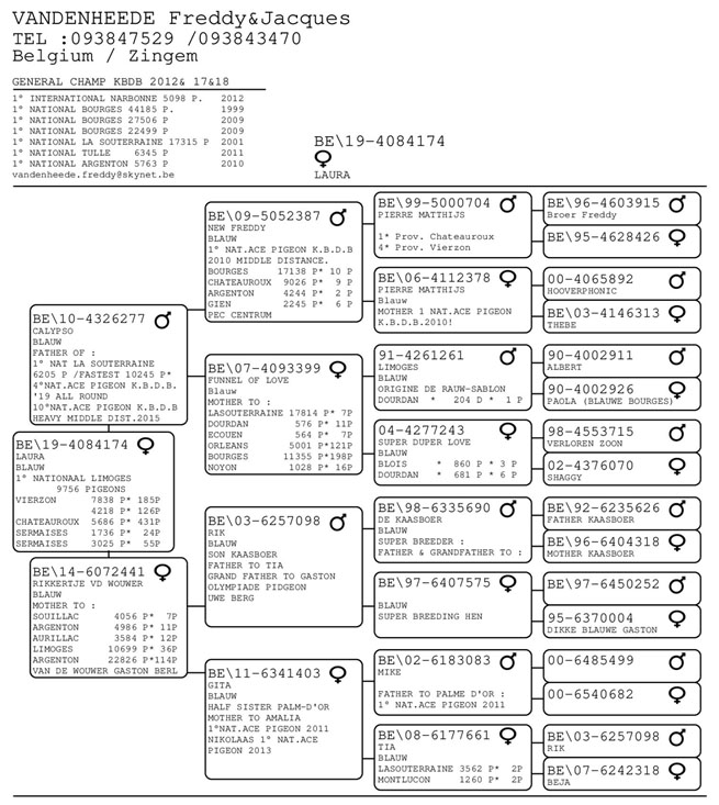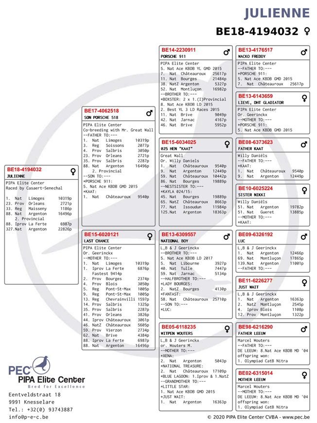 獲得2020年利蒙治II國家賽(一歲鴿)全國9.756羽冠軍為範希 雅克&福雷迪(Vandenheede Jacques & Freddy)鴿舍,該舍其實有3羽選手鴿同時抵達,表現特別突出,獲得冠軍是B19-4084174灰母,打下鴿鐘時間是在7月18日(星期六)下午15時26分01秒歸巢,翔距622.608公里,創下平均分速1308.27米/分,第二羽是15時26分19秒,第三羽是15時26分22秒。