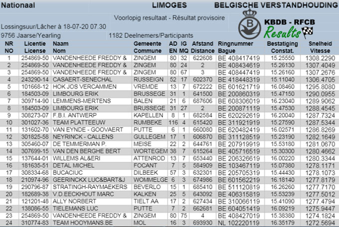 2020年比利時利蒙治II國家賽(一歲鴿9.756羽)全國前24名成績。