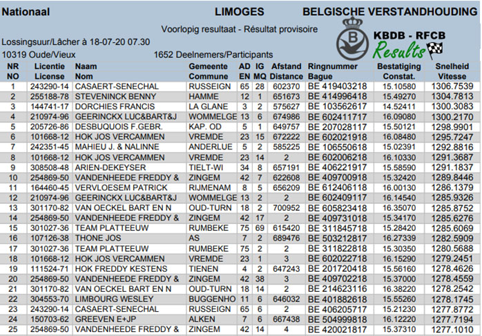 2020年比利時利蒙治II國家賽(成鴿10.319羽)全國前25名成績。