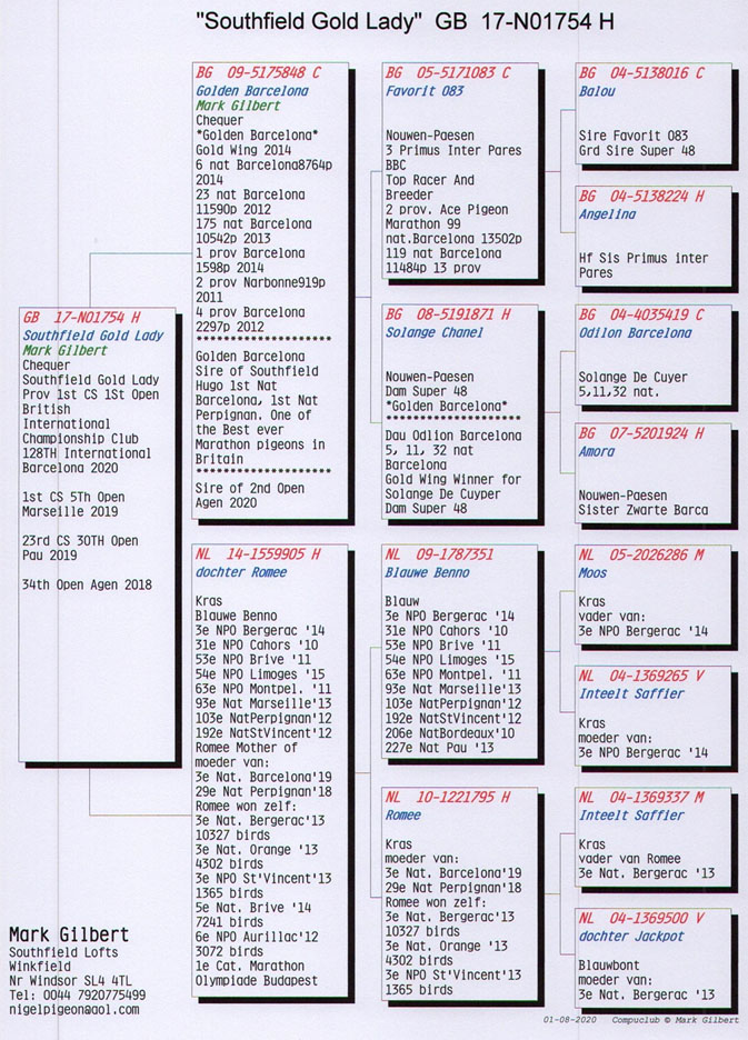 巴賽隆納國際賽英格蘭成鴿組全國冠軍 : 吉伯特 馬克(Gilbert Mark)鴿舍 (Winkfield, Windsor),該舍冠軍鴿GB17-N01754斑母在(星期日)凌晨 2時4分完成打鐘,空中距離為1153.32公里,平均分速為684.76米/分。又是”黃金巴塞隆納號B09-5175848斑公”直女,厲害…..超強表現。