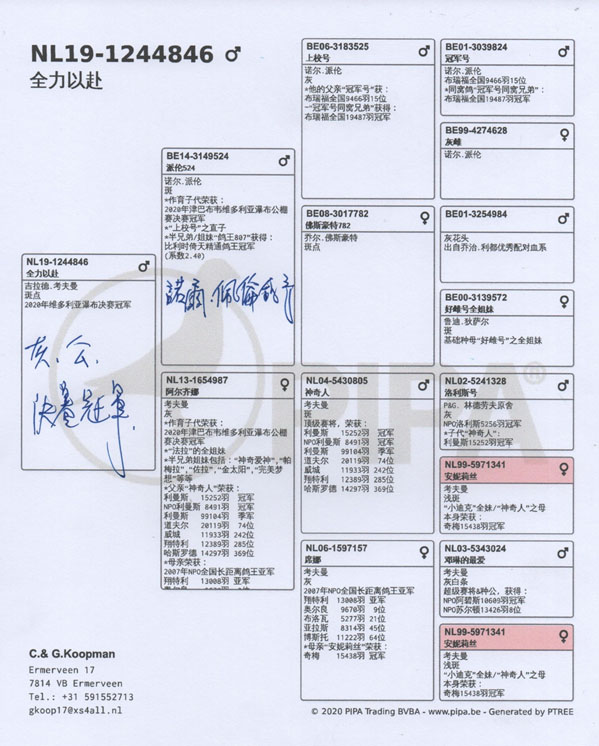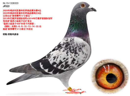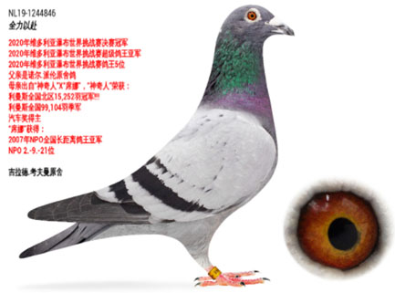 獲得總決賽冠軍為荷蘭強豪考布曼鴿舍,冠軍鴿NL19-1244846灰公。標價:$13萬6.000歐元