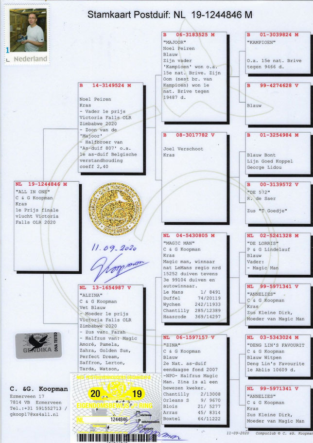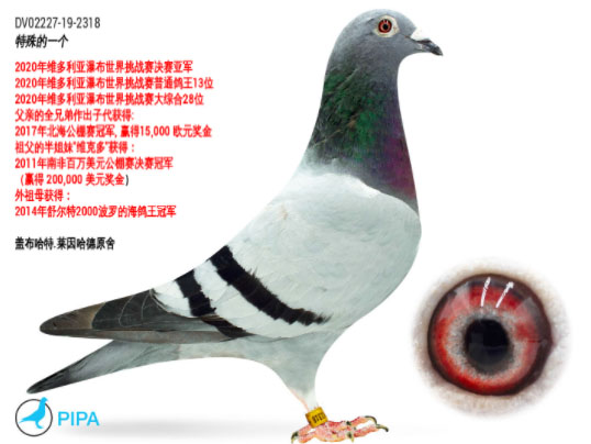 獲得總決賽亞軍為荷蘭強豪考布曼鴿舍,亞軍鴿DV02227-19-2318灰公。$13.000歐元