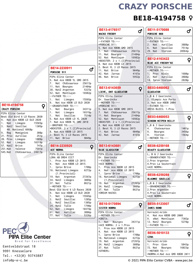 獲得2020年利蒙治I國家賽(成鴿)全國15.547羽冠軍為阿倫-德基瑟(Arien - De Keyser)鴿舍,該舍冠軍鴿B18-4194758灰母是在6月12日(星期六)下午16時37分完成打鐘,空距為657.191公里,平均分速為1199.55 米/分。。