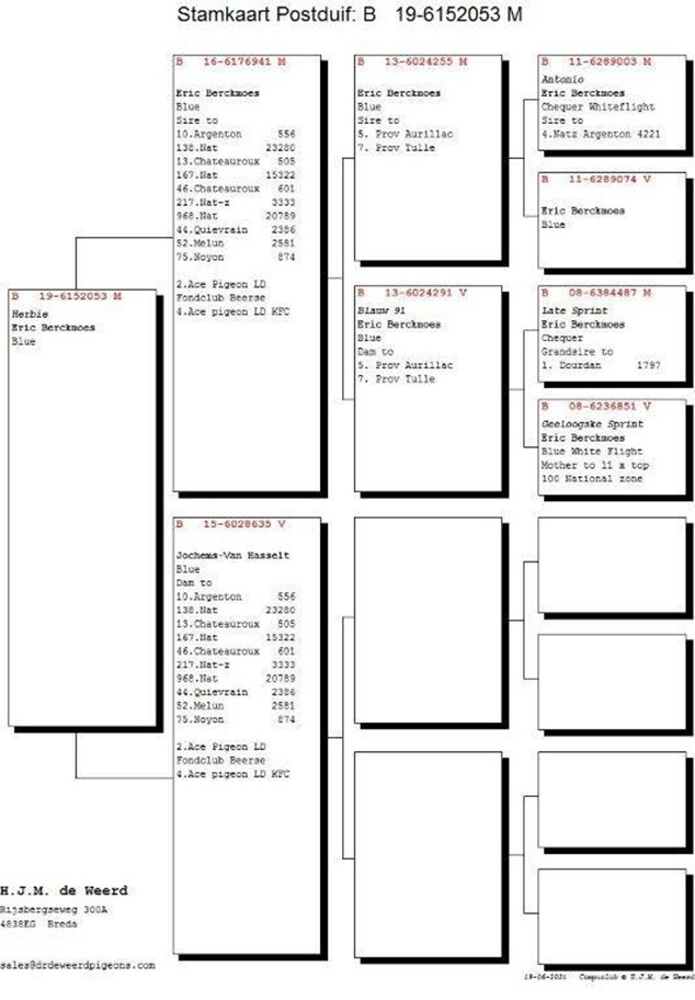 獲得比利時瓦朗斯國家賽"成鴿組"7.517羽全國冠軍是尼寇.迪威德-伯克莫斯(Nicole De Weerd-Berckmoes)鴿舍,該舍冠軍鴿B19-6152053灰公是在6月19日(星期六)晚上21時08分完成打鐘,空距為700.591公里,平均分速為1528.4米/分。