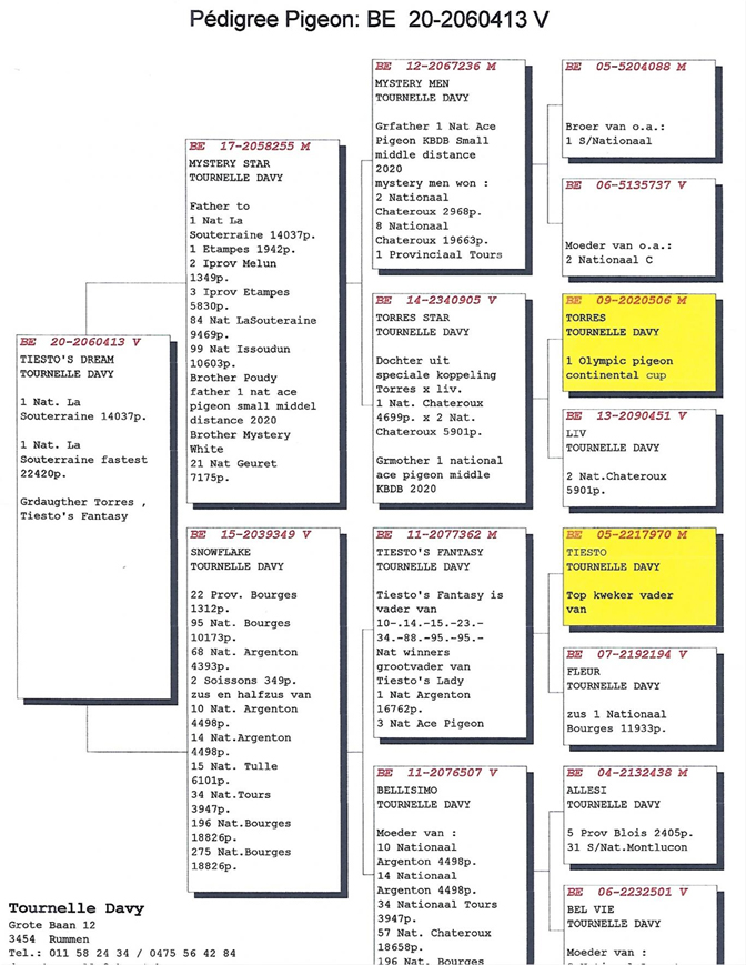 獲得比利時拉斯特年I (La Souterraine I )全國一歲鴿組13.944羽冠軍大衛.吐尼爾(Tournelle Davy)鴿舍,該舍冠軍鴿在6月28日(星期一)下午17時8分完成打鐘,空距為583.838公里,平均分速為1363.79米/分,此鴿同時也是拉斯特年I交鴿總數22.289羽的總冠軍鴿。