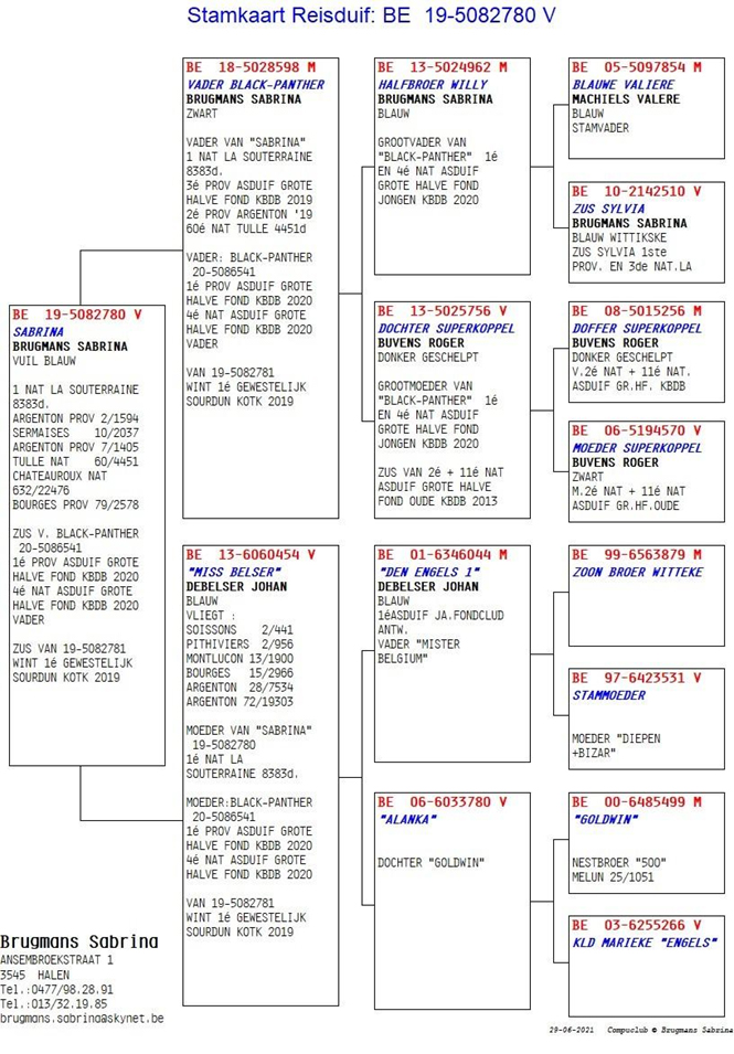獲得比利時拉斯特年I (La Souterraine I )全國成鴿組8.345羽冠軍為布魯格曼.薩布麗娜(Brugmans Sabrina)鴿舍,該舍冠軍鴿是在6月28日(星期一)下午17時15分完成打鐘,空距為587.595公里,平均分速為1350.59米/分。