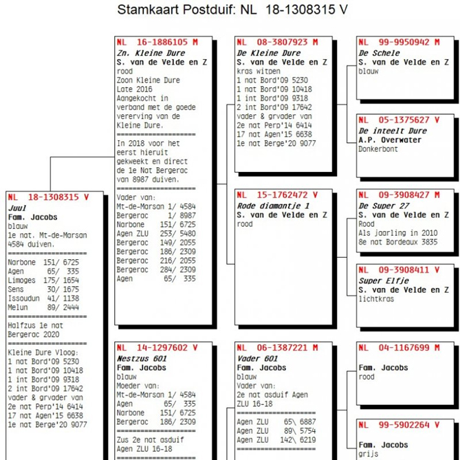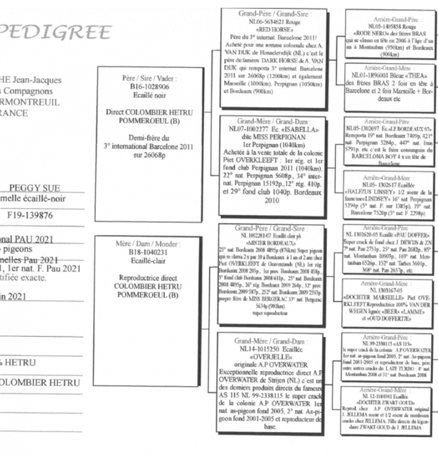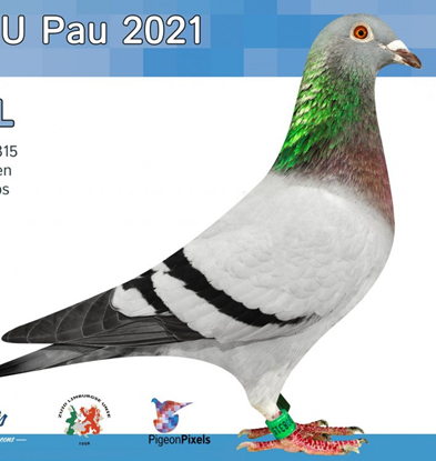 2021年波城國際賽,獲得國際賽14.246羽總冠軍是法國珍.雅克.迪蒙斯(Dimanche Jean-Jacques)鴿舍,該舍冠軍鴿F19-139876斑母是在6月25日(星期五)下午15時44分完成打鐘,空距為685.366公里,平均分速為1345.92米/分。