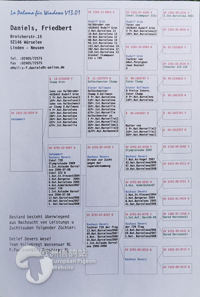 波城 (國際賽)德國1.148羽全國冠軍鄧尼斯-貝克斯(Daniels-Berks)鴿舍,該舍冠軍鴿DV1519-16-0254斑母是在6月25日(星期五)下午18時59分完成打鐘,空距為919.922公里,平均分速為1305.38米/分,國際賽14.246羽排名第4位。