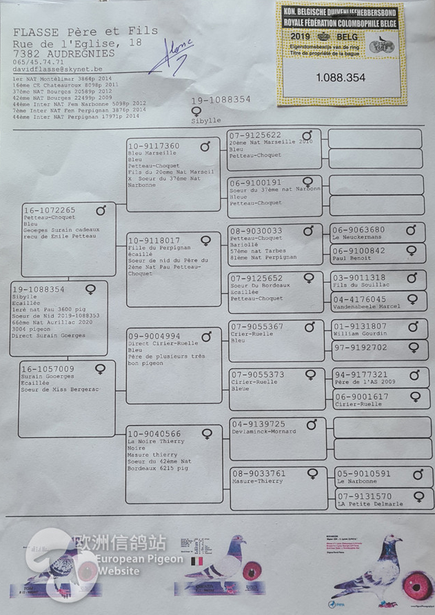 獲得波城 (國際賽) 比利時全國3.514羽冠軍是薩莫爾.法拉瑟(Flasse Samuel)鴿舍,該舍冠軍鴿B19-1088354斑母是在6月25日(星期五)下午17時21分完成打鐘,空距為786.621公里,平均分速為1297.95米/分,國際賽14.246羽排名第5位。