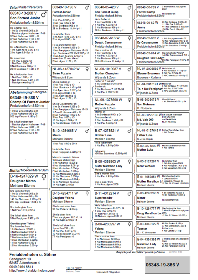 獲得2021年聖維仙國際賽(成鴿8.269羽)總冠軍是德國福登霍芬父子(Freialdenhofen & Sons)鴿舍,該舍冠軍鴿DV06348-19-866斑公是在7月18日(星期日)早上 05時01分完成打鐘,空距為988.044公里,平均分速為1064.7米/分。