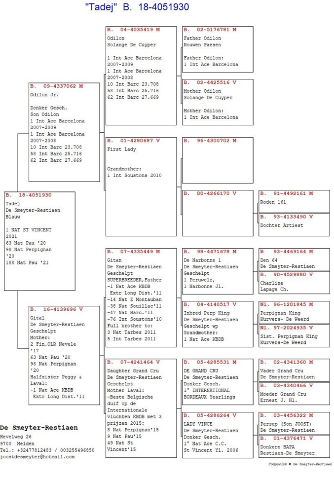 2021年聖維仙國際賽比利時全國3080羽冠軍是狄斯麥特-瑞斯帝安(De Smeyter-Restiaen)鴿舍,該舍冠軍鴿BE18-4051930灰公是在7月17日(星期六)晚上 21時56分完成打鐘,空距為876.266公里,平均分速為999.39米/分。