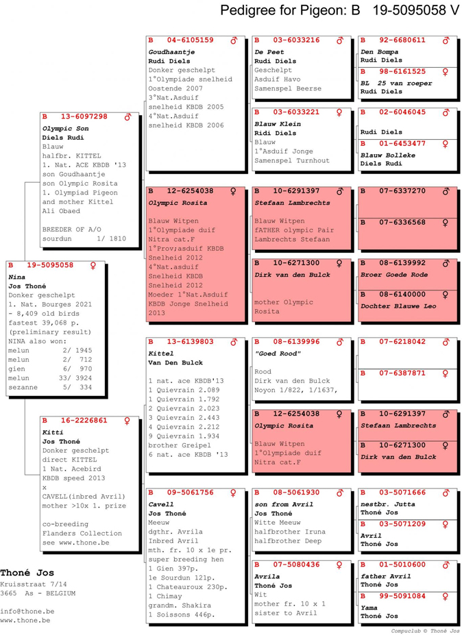 獲得比利時波治II全國賽交鴿總數39.072羽冠軍是老將托內.喬斯(Thoné Jos)鴿舍,該舍冠軍鴿B19-5095058斑母(屬成鴿組8.410羽冠軍)是在7月31日(星期六)12時18分,完成打鐘,空距為491.957公里,平均分速為1621.75米/分。