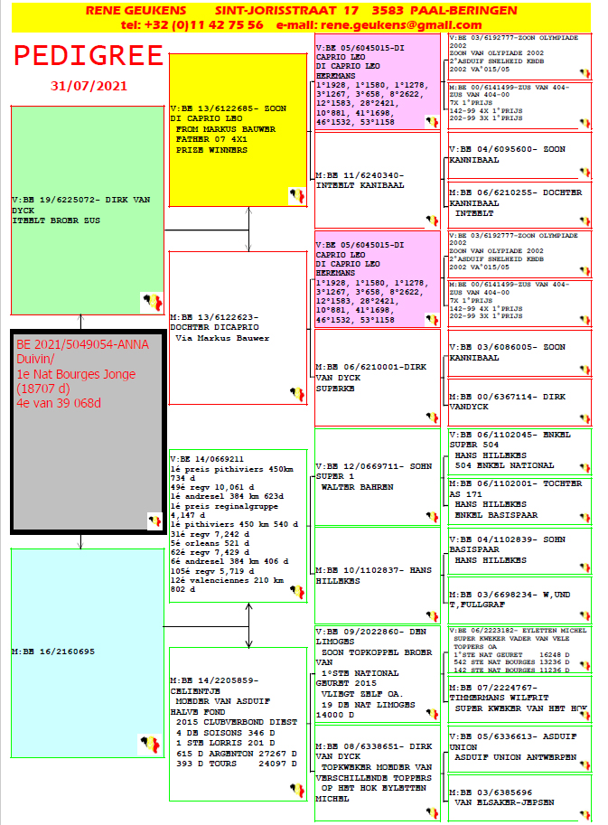贏得比利時波治II幼鴿組18.710羽全國冠軍是雷內.赫肯斯(Geukens René)鴿舍該舍冠軍鴿B21-5049054斑母是在7月31日(星期六)12時11分,完成打鐘,空距為478.614公里,,平均分速為1612.22 米/分。