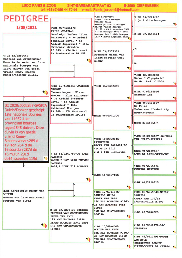 獲得比利時波治II一歲鴿11.952羽全國冠軍是魯道.帕尼斯父子(Panis Ludo & Zoon)鴿舍,該舍冠軍鴿B20-5068287斑母是在7月31日(星期六)12時11分完成打鐘,空距為478.008公里,平均分速為1613.35米/分。