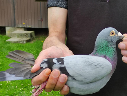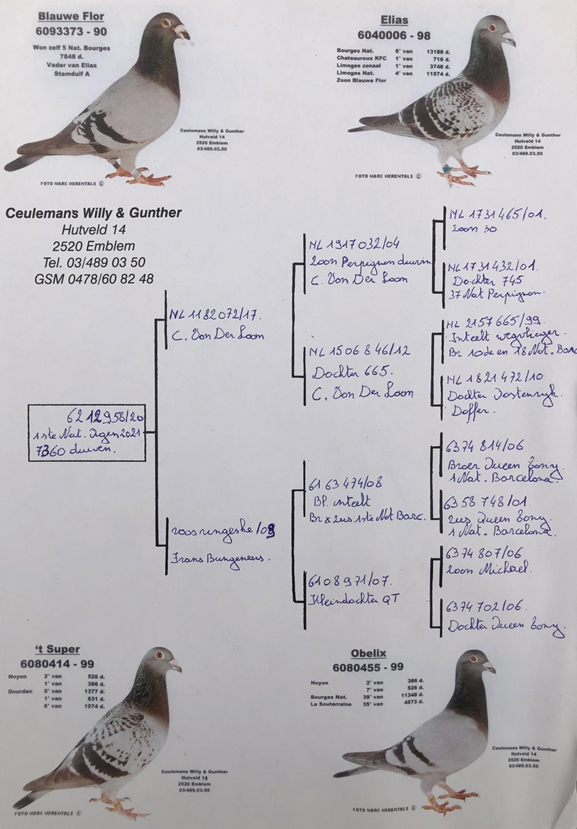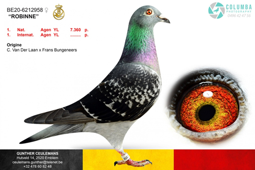 阿讓國際賽比利時一歲鴿組7.360羽冠軍為岡特.庫勒曼(Ceulemans Gunther)鴿友,該舍冠軍鴿B20-6212958斑母是在7月2日(星期五)下午17時52分完成打鐘,空距為853.042公里,平均分速為1314.56米/分,此鴿同時也是2021年阿讓國際賽交鴿總數35.725羽的總亞軍鴿。