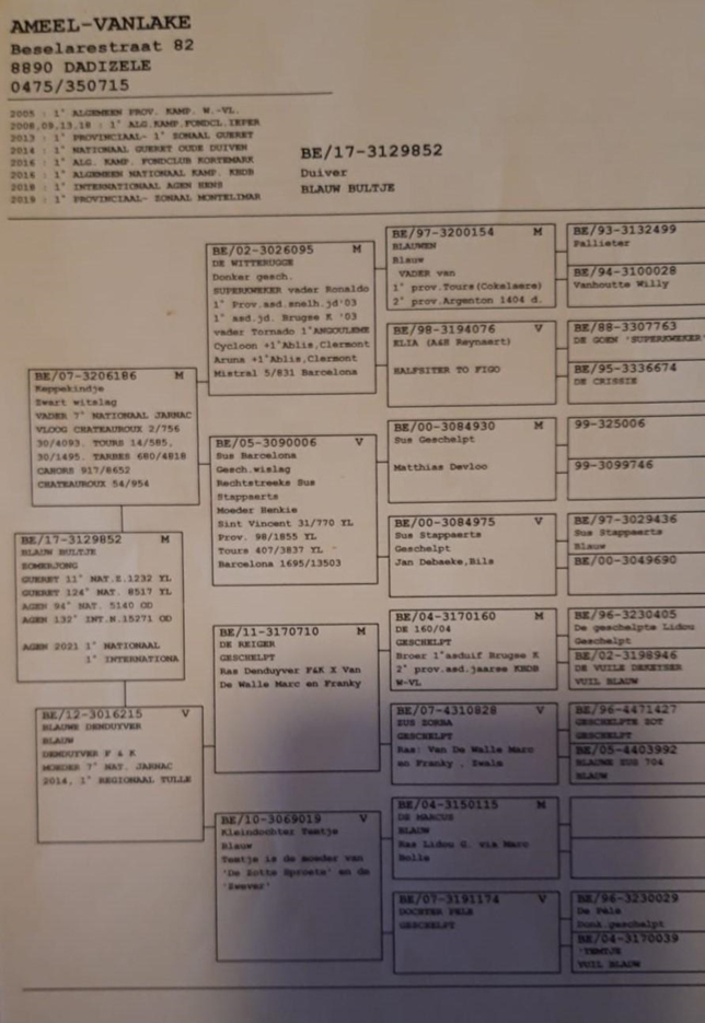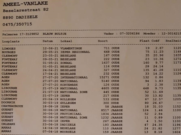 阿讓國際賽比利時成鴿組6.939羽冠軍為阿梅爾-凡拉克(Ameel-Vanlake)鴿友,該舍冠軍鴿B17-3129852灰公是在7月2日(星期五)下午17時00分,完成打鐘,空距為789.319公里,平均分速為1314.84 米/分,此鴿同時也是2021年阿讓國際賽交鴿總數35.725羽的總冠軍鴿。