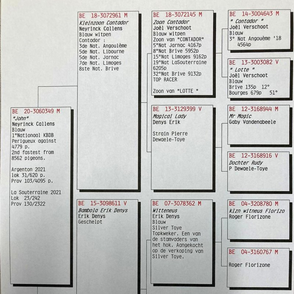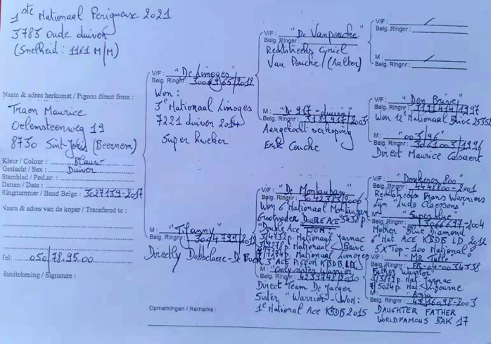 獲得2021年比利時派利奎(成鴿7.517羽)全國冠軍為莫里斯.特倫(Traen Maurice)鴿舍,該舍冠軍鴿B17-3027139灰公是在7月23日(星期五)下午17時24分完成打鐘,空距為691.017公里,平均分速為1161.7 米/分,此鴿同時也是派利奎國家賽交鴿總數8.562羽的總冠軍鴿。