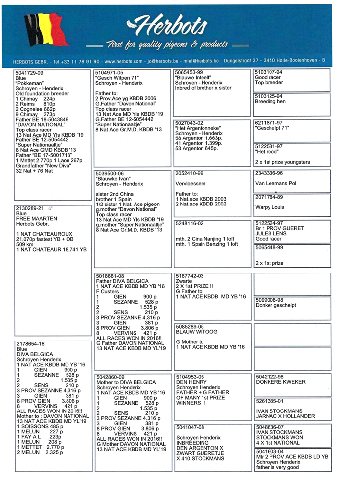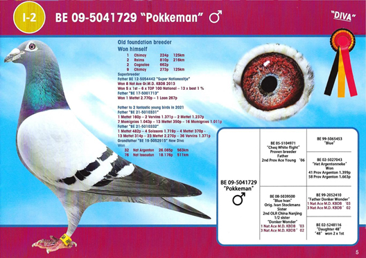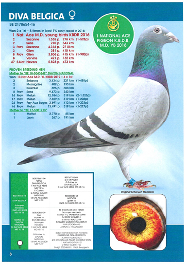 獲得比利時拉斯特年I I(La Souterraine II )全國成鴿組3.084羽冠軍為范登阿貝爾-範帕森(Van den Abbeel-Van Paesschen)鴿舍,該舍冠軍鴿B19-4050573斑母是在8月28日(星期六)下午16時04分完成打鐘,空距為563.349公里,平均分速為1163.86米/分,此鴿同時也是比利時拉斯特年II交鴿總數17.399羽的總冠軍鴿。