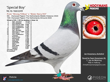 許多鴿子上了年紀,就會失去一些東西,但是“特殊男孩”卻是越釀越香的酒,年紀越大,越優秀。他已經獲得了超過6次NPO中荷蘭第7區前10位,以及25次入賞前1%的好名次(無重複)!!在之前的伊蘇丹長距離賽上,他獲得了半全國14,000羽亞軍(第III大區與第IV大區)。他在之前賽季已經獲得了一長串的鴿王頭銜。在最後一場成鴿賽之後,他現在已經是2021年中荷蘭第7區綜合鴿王冠軍。這是一個需要從20,000羽鴿子的激烈競爭中脫穎而出的頭銜。一羽5歲齡的雄鴿能獲此殊榮,實在罕見。他現在可以凱爾克德里爾的楊.胡曼斯安全屋或者種鴿舍中,安享退休後的生活了。