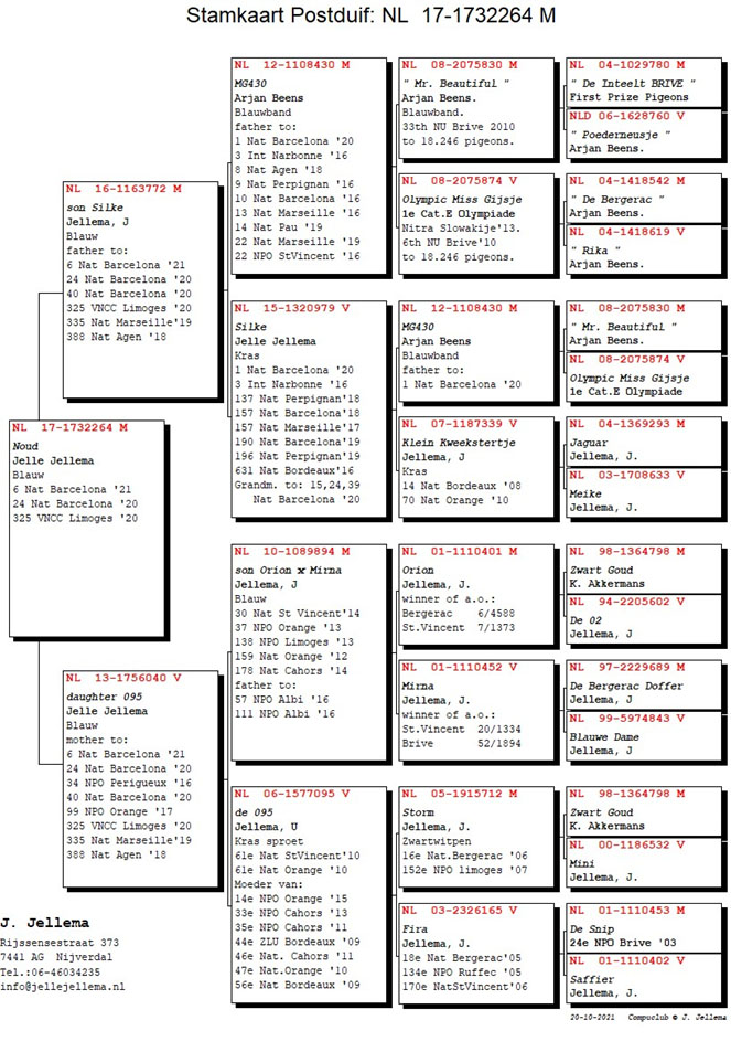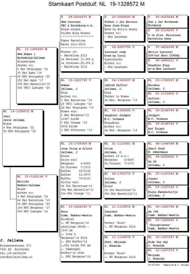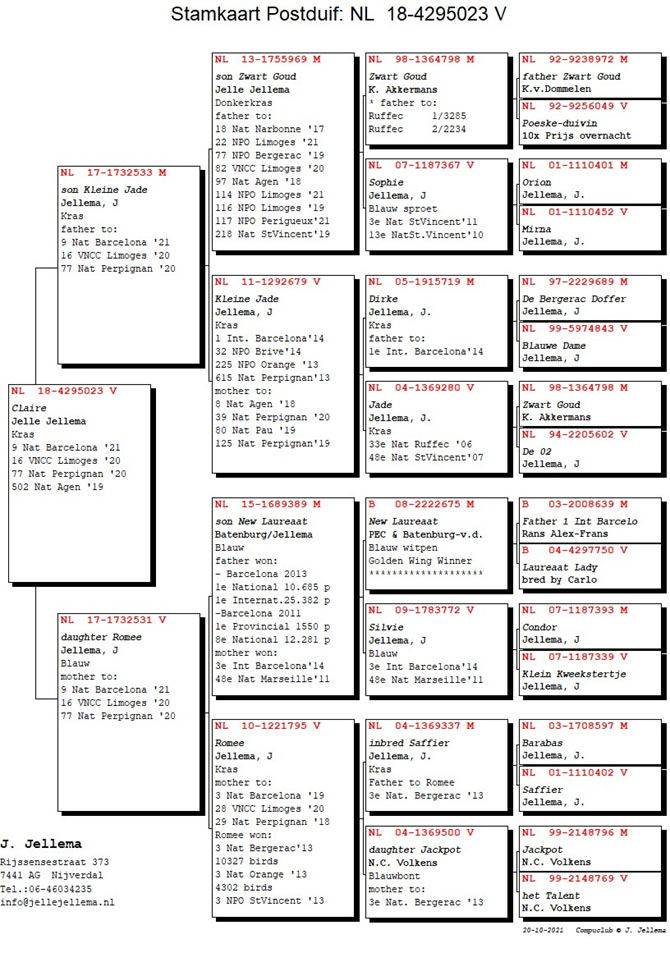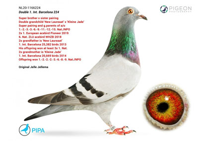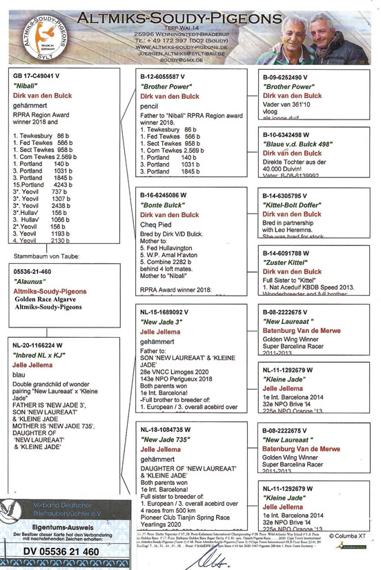 耶勒以“布麗塔”(BE19-4195209 Britta)和“蕾娜直子”(NL19-1328595 son Rena )獲得長距離2000聯盟最佳頭銜前名次。“布麗塔”引進自卡羅.吉塞布賴特,眾所周知卡羅.吉塞布賴特擁有一支傑出的種鴿隊伍。通過與卡羅的合作作育的“布麗塔”增強了耶勒比賽戰隊中實力。這羽雌鴿獲得2021年NPO利蒙治6位、波品納全國21位和馬賽全國63位。“蕾娜直子”獲得2021年波品納全國4873與159位和馬賽全國4310羽176位,由耶勒本人作育。下面我們再次看到了巴賽隆納國際冠軍成為成功的基礎,因為祖父母包括“小碧玉”和“特殊的一個”(FR12-034553 Special One)。“蕾娜直子”的母親“蕾娜”(NL14-1559583 Rena)本身獲得2016年波城3788羽5位、2018年巴賽隆納全國8位和2016年馬賽全國3320羽30位。