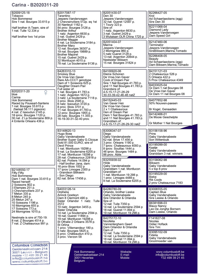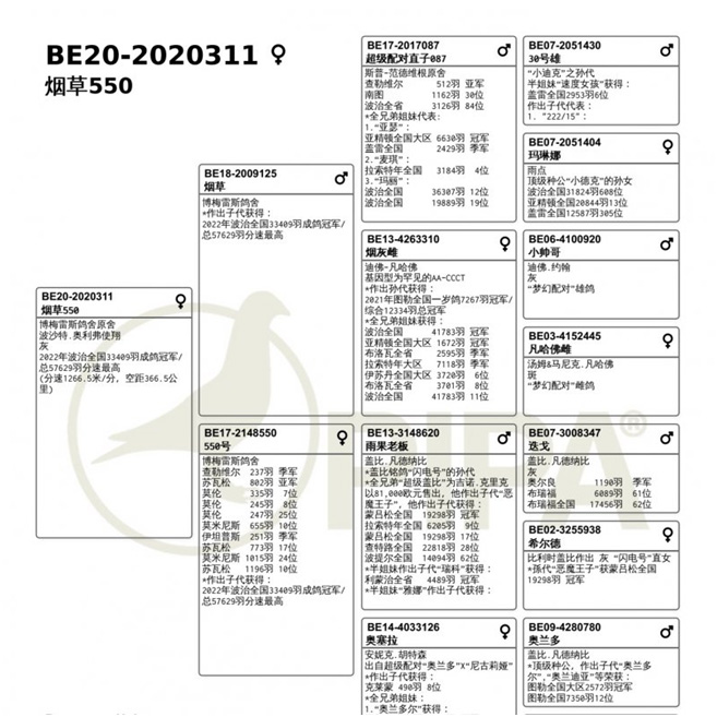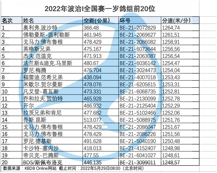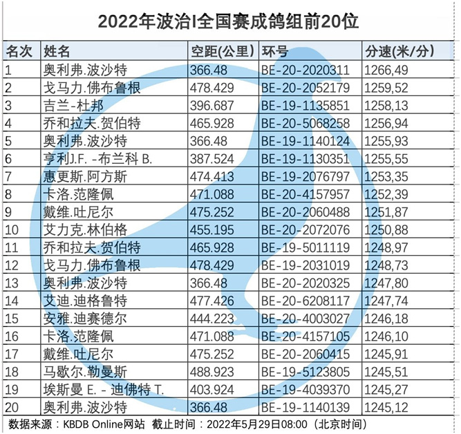 獲得波治全國(成鴿組33.410羽)冠軍是奧利弗.波沙特Poussart Olivier (Vaulx)鴿舍,該舍冠軍鴿B20-2020311灰母,是在5月28日 (星期六) 12時19分22秒完成打鐘,空中距離為366.48公里,平均分速為1266.49 米/分,該鴿同時也是波治I 集鴿總數全國57.630羽總冠軍鴿。