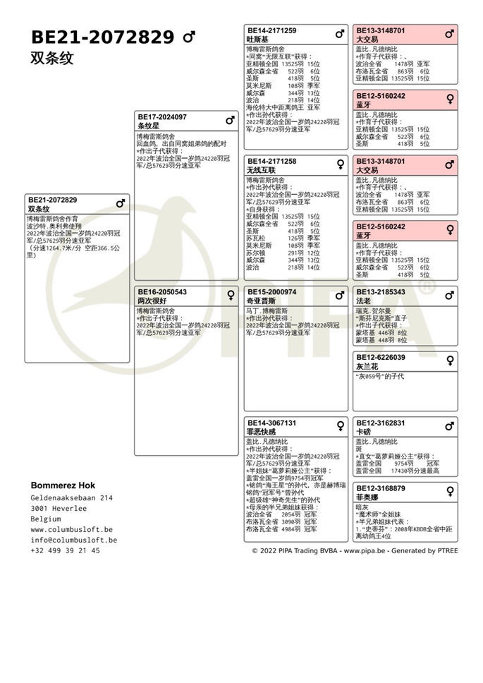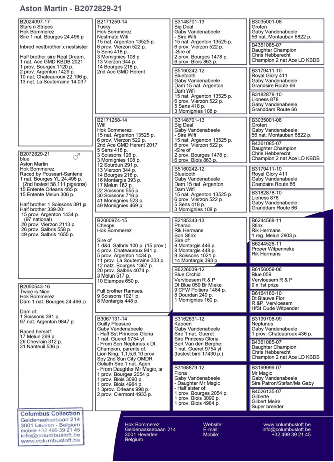 獲得波治全國(一歲鴿組24.220羽)冠軍是奧利弗.波沙特Poussart Olivier (Vaulx)鴿舍,該舍冠軍鴿B21-2072829灰公是在5月28日 (星期六) 12時19分46秒完成打鐘,空中距離為366.48公里,平均分速為1264.74米/分獲得冠軍。血統: 蓋比x 瑞克.赫爾曼x 福落森鴿系。