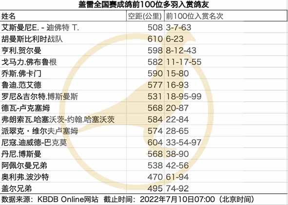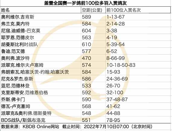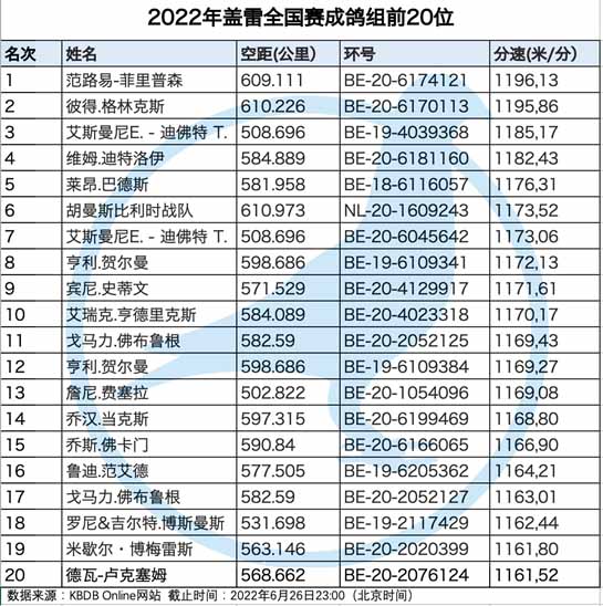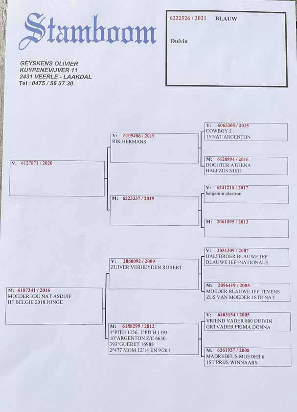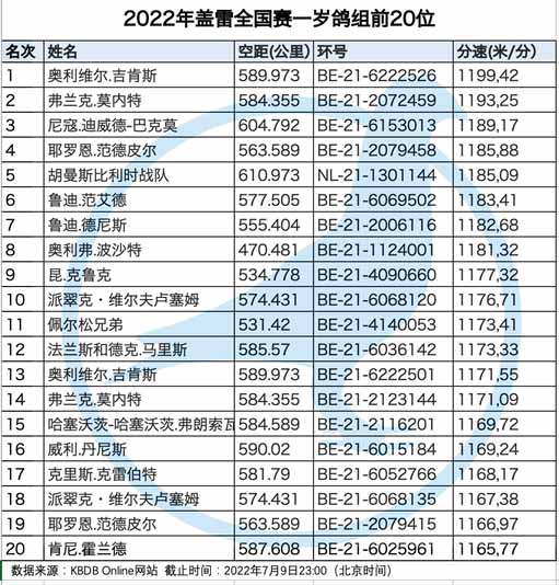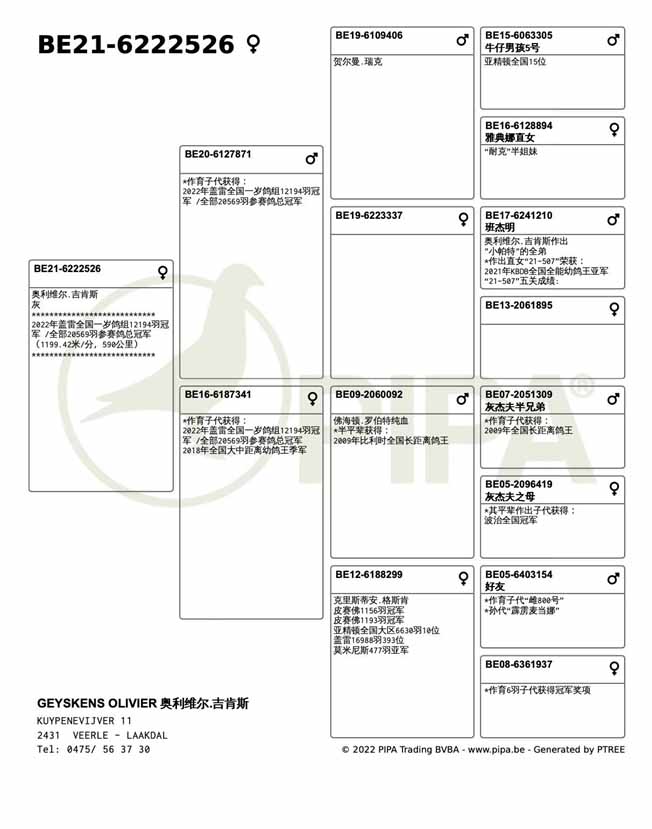 獲得比利時蓋雷全國(一歲鴿12.194羽)冠軍為奧利維爾.吉肯斯(Geyskens Olivier)_鴿舍,該舍冠軍鴿B21-6222526灰母是在7月9日(星期六)下午15時21分完成打鐘,空中距離為589.973公里,平均分速為1199.42 米/分,同時也是集鴿總數20.569羽總冠軍鴿。