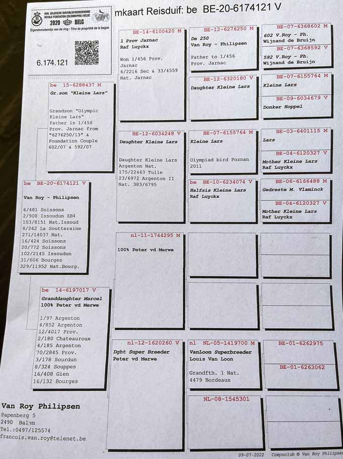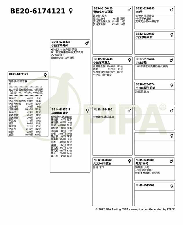 比利時成鴿8.375羽全國冠軍是範洛伊-菲里普森( 範洛伊-菲里普森)-鴿舍,該舍冠軍鴿B20-6174121灰母,7月9日(星期六)下午15時39分完成打鐘,空中距離為609.111公里,,平均分速為1196.13 米/分。