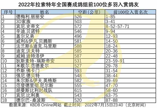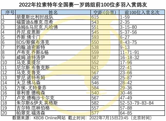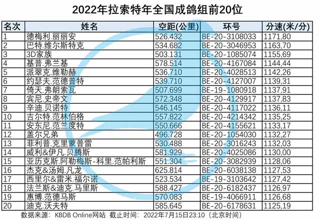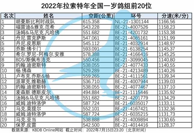 2022年比利時拉斯特年( La Souterraine 約550公里)國家賽,7月13日集鴿總數11.668羽(含成鴿組4.907羽+一歲鴿組6.761羽)於7月15日(星期五)早上7點整放鴿。