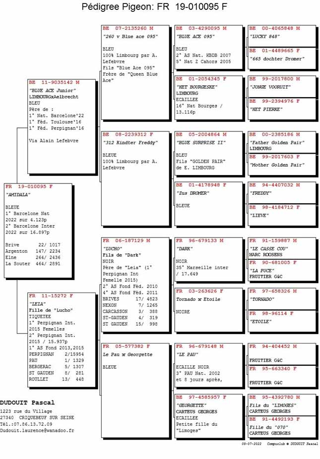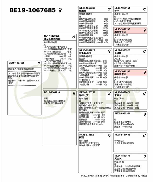 法國巴塞羅那(國際賽) 2022年全國4.123羽冠軍是(Dudouit P & G)鴿舍,該舍冠軍鴿F19-010095灰母是在7月9日 (星期六)早上5時49分完成打鐘,空距為866.53公里,平均分速為926.75 米/分。