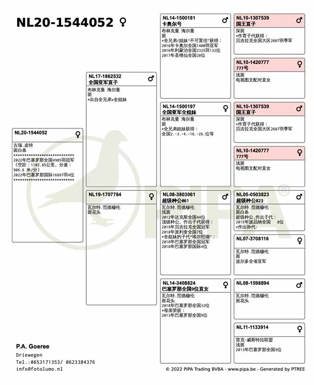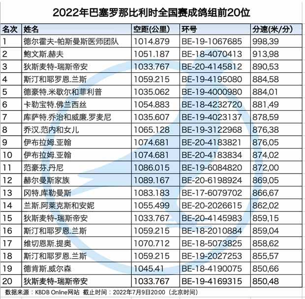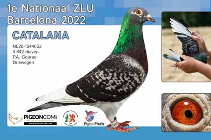巴塞羅那(國際賽) 2022年荷蘭4.905羽全國冠軍-是古瑞.皮特(Goeree Pieter)鴿舍,該舍冠軍鴿NL20-1544052班白羽.母是在7月9日(星期六)早上10時30分完成打鐘,空中距離為1102.85公里, 平均分速為906.60 米/分。