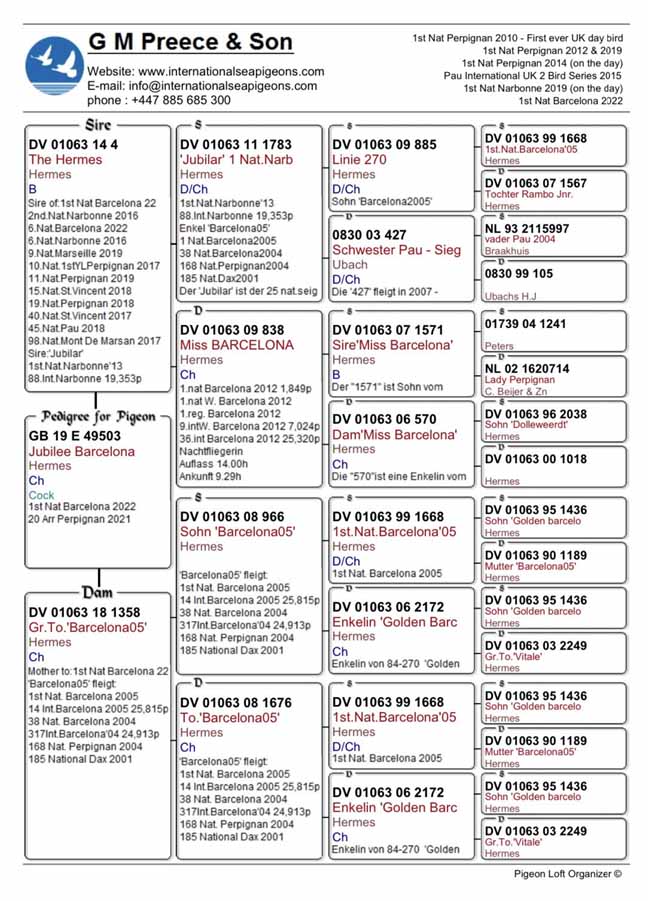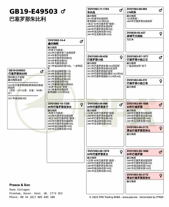 英格蘭巴塞羅那(國際賽) 2022年全國221羽冠軍是普利斯父子(Preece & Son)鴿舍,該舍冠軍鴿GB19-E49503班公是在7月9日(星期六)下午15時26分完成打鐘,空距為1071.02公里,平均分速為708.24 米/分。