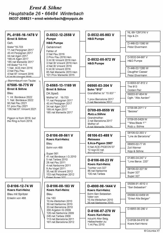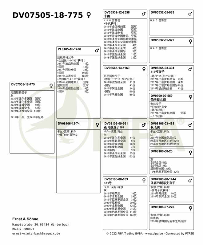 2022年波城國際賽,獲得國際賽15.536羽總冠軍是德國-厄恩斯特父子(Ernst & Sohne) 鴿舍,該舍冠軍鴿DV07505-18-775灰母是在6月27日(星期一)下午16時48分完成打鐘,空距為780.613公里,平均分速為1327.42米/分。