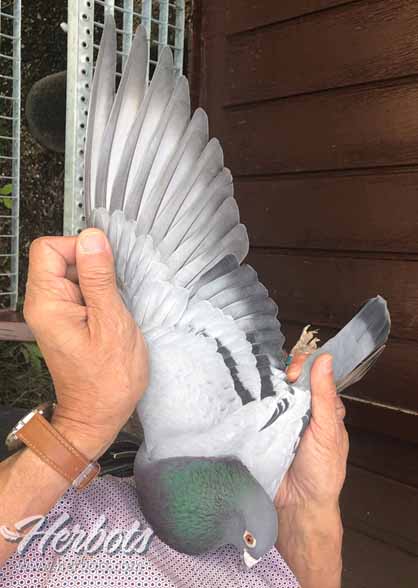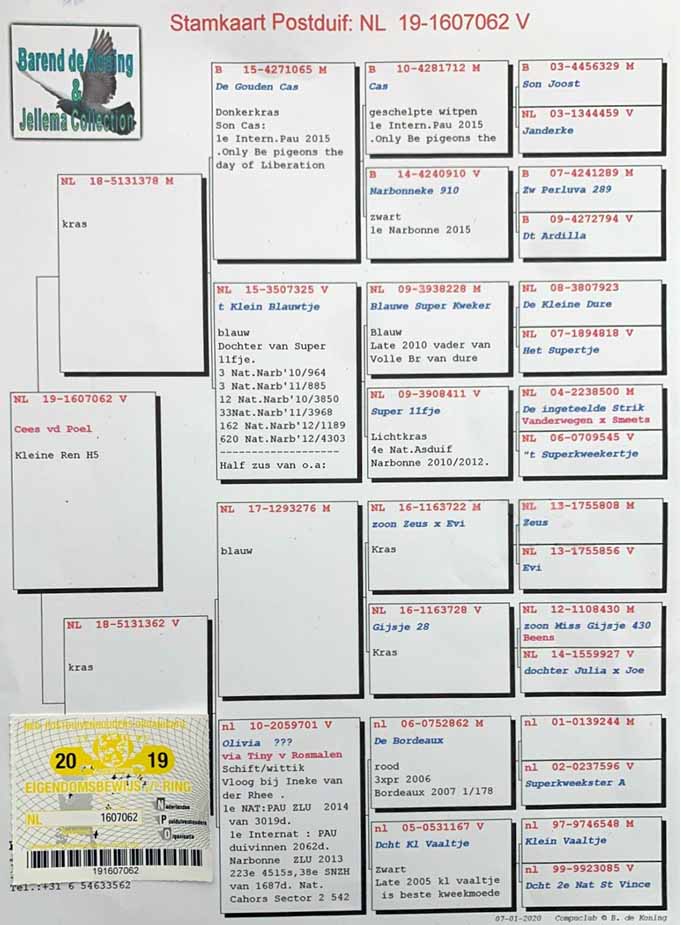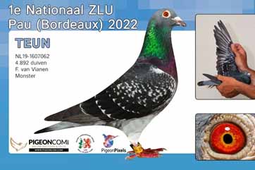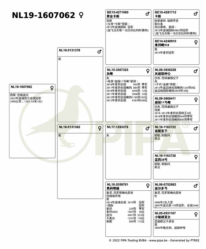 波城國際賽荷蘭成鴿全國4.994羽冠軍- F.範維亞嫩 ( van Vianen F. )鴿舍,該舍冠軍鴿NL19-1607062斑母是在6月27日 (星期一)下午18時26分完成打鐘,空距為867.584公里,平均分速為1263.63 米/分。