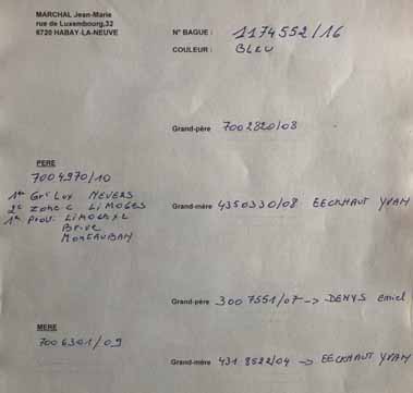 波城國際賽比利時全國3.743冠軍-馬沙.J.馬裡斯 (Marchal J Marie)鴿舍,該舍冠軍鴿B16-1174552灰公是在6月27日(星期一)下午16時10分完成打鐘,空距為713.396公里,平均分速為1296.42 米/分。