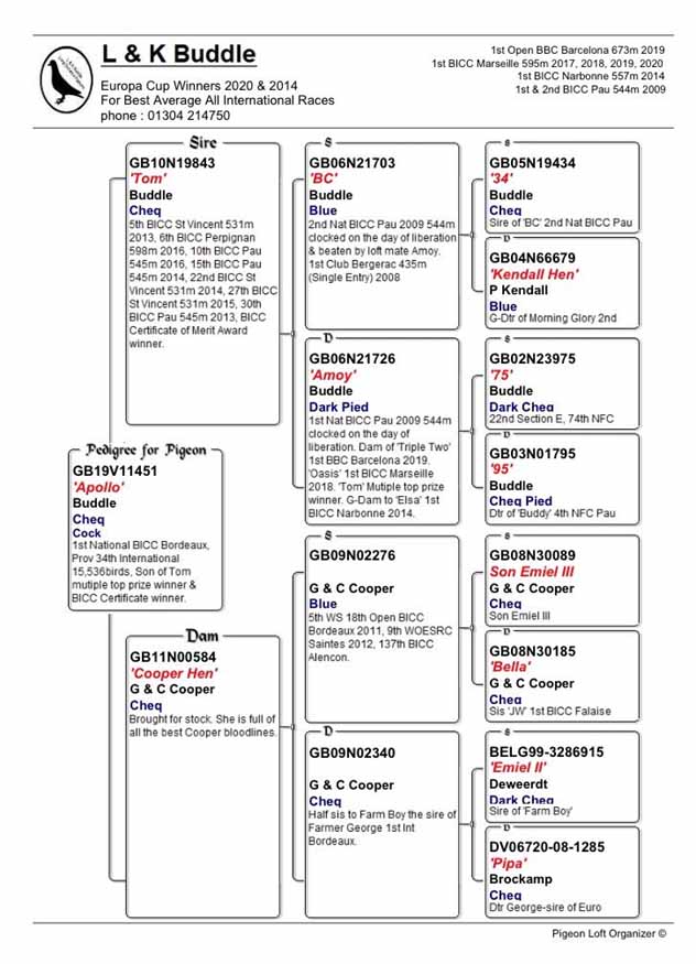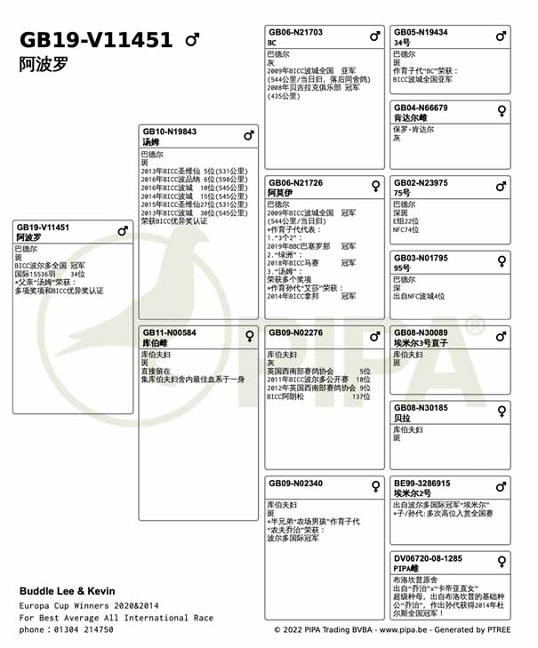 英格蘭波城(國際賽)"成鴿"全國259羽冠軍- L & K.布德爾 (Buddle L & K )鴿舍,該舍冠軍鴿GB19-V11451斑公是在6月27日(星期一)下午16時25分完成打鐘,空距為707.58公里,平均分速為1251.28 米/分。
