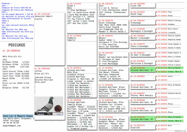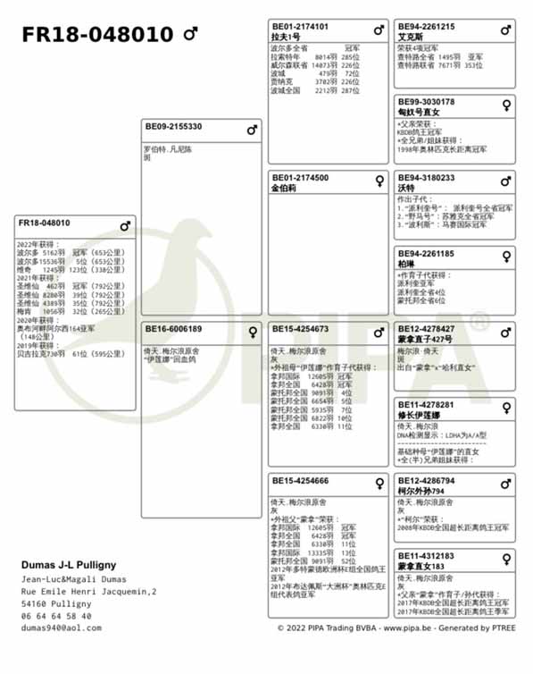 波城(國際賽)法國全國5.126羽冠軍-是讓-盧克&瑪嘉麗.杜馬斯( Jean-Luc & Magali Dumas ) 鴿舍,該舍冠軍鴿FR18-048010灰公是在6月27日(星期一)下午15時28分完成打鐘,空距為653.424公里,平均分速為1285.68 米/分。