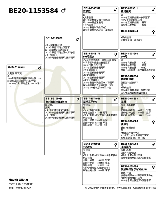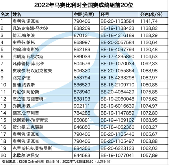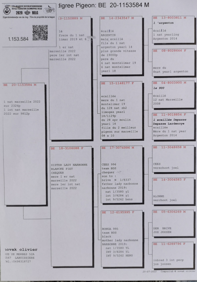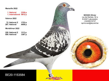獲得馬賽(Marseille)國際賽9.812羽總冠軍為比利時奧利佛.諾瓦克(Novak Olivier)鴿舍,該舍冠軍鴿BE20-1153584斑.公是在7月25日(星期一)凌晨0時32分完成打鐘,空距為790.406公里,平均分速為1141.74米/分。