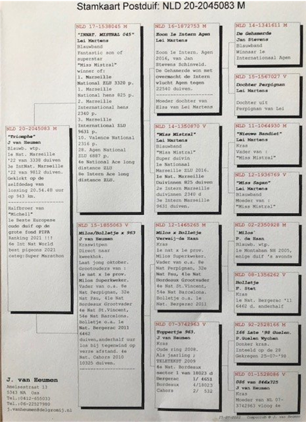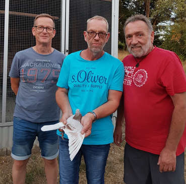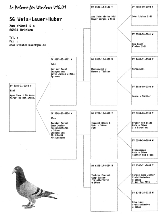獲得德國馬賽(國際賽)"成鴿"全國893羽冠軍- 是(Weis+Lauer+Huber SG )鴿舍,該舍DV1186-21-0268銀母,冠軍鴿是在7月25日(星期一)凌晨2時25分完成打鐘,空距為703.197公里,平均分速為872.87 米/分.
