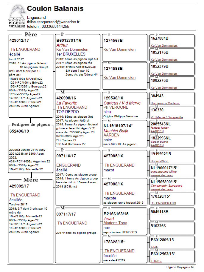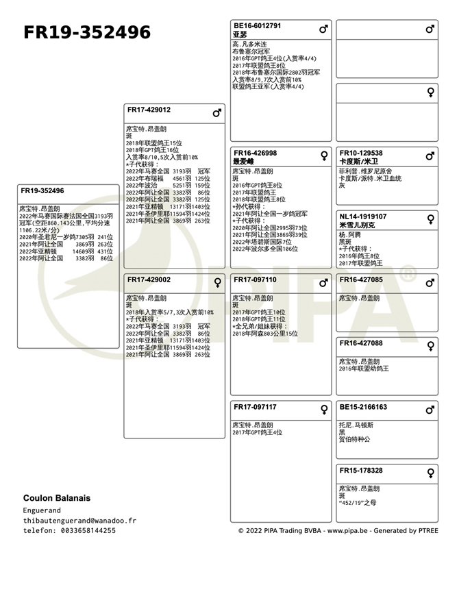 獲得法國馬賽(國際賽)"成鴿"全國3.193羽冠軍- 是席寶特.昂蓋朗(Enguerand Thibaut)鴿舍,該舍冠軍鴿FR19-352196灰母是在7月25日(星期一)凌晨1時57分完成打鐘,空距為860.143公里,平均分速為1106.22米/分。