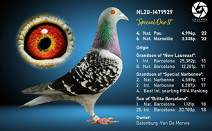 “特殊的一個II號”至少兩次在全國馬拉鬆比賽中大放異彩。6月27日,他榮獲波爾多全國4位。由於天氣原因,無法在原放飛地波城放飛。推遲了3天后,決定在波爾多放飛。7月24日,“特殊的一個II號”再次達到巔峰,獲得馬賽全國7位。來看他的血統,我們再次發現了“新榮耀號”這一特別優質遺傳質量的證據。“特殊的一個2號”之父是是“新榮耀號”直子(NL18-623)。母親是“巴塞羅那布麗塔”(2018年巴塞羅那全國1,121羽冠軍),也多次證明了自己是一羽頂尖種鴿。