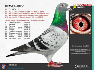 早在幾年前,楊.胡曼斯就啟動了他在比利時和英國以及荷蘭參賽的計畫。目的是為了讓“哈利”家族參加這三個國家競爭最激烈的比賽。幾年後,胡曼斯戰隊在各個國家比賽中都穩居前列。今年他們也都取得了一系列令人矚目的成績。拿荷蘭維克奧爾堡(Wijk en Aalburg)的胡曼斯荷蘭戰隊來說,他們獲了荷蘭全國最佳鴿舍亞軍(WHZB-TBOTB最佳鴿友亞軍)、全省最佳速度鴿舍冠軍,全省最佳長距離鴿舍冠軍(賽季初共有1000家鴿舍,20,000羽鴿子)。艱苦的2018賽季逆風和高溫屢見不鮮,克利斯蒂安(Christian)便獲得荷蘭最佳鴿友冠軍。而如今,在同樣艱難的條件下,他又獲得了亞軍頭銜。楊.胡曼斯荷蘭戰隊憑藉“哈利男爵398”(Harry Baron 398 NL17-1410398)以及“西爾維”(Silviu NL19-1022619)獲得了NPO全國長距離鴿王5位和12位。而位於比利時摩爾(Mol)的胡曼斯比利時戰隊憑藉“哈利直孫095”(095 Grandson Harry NL19-1023095)獲得了KBDB全國中距離鴿王季軍。以下是所獲的部分成績和頭銜: