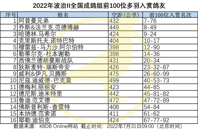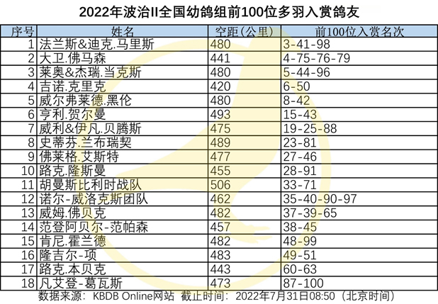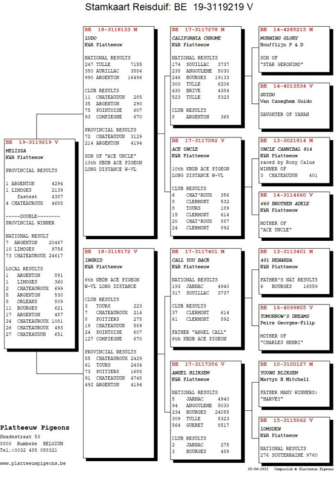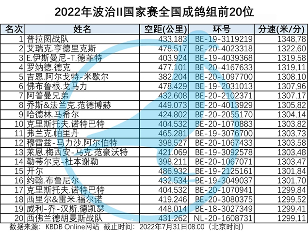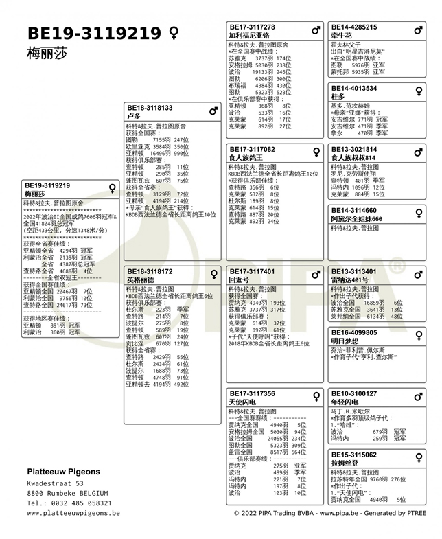 獲得比利時波治II全國賽交鴿總數41.804羽總冠軍是普拉圖戰隊(Team Platteeuw)鴿舍,該舍冠軍鴿B19-3119219灰母(屬成鴿組7.606羽冠軍)是在7月30日(星期六)12時51分,完成打鐘,空距為433.183公里,平均分速為1348.78米/分。