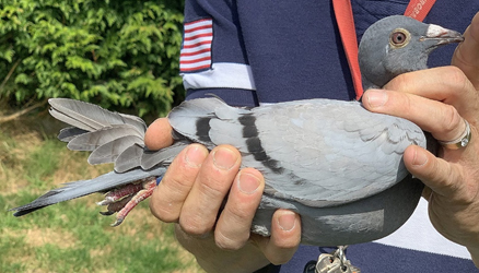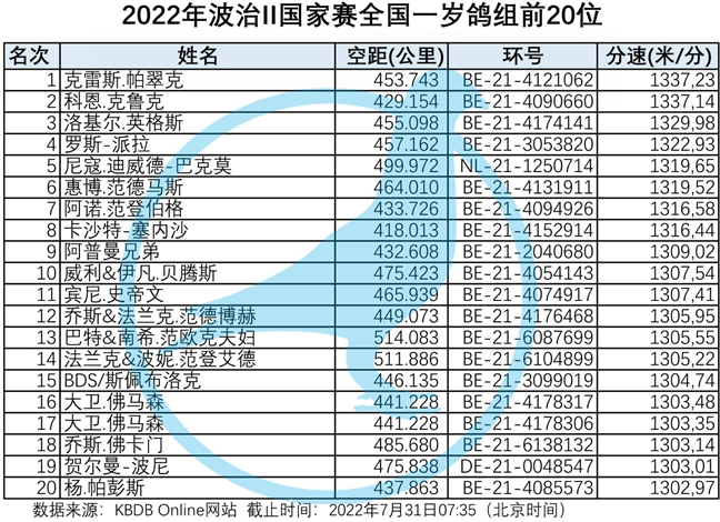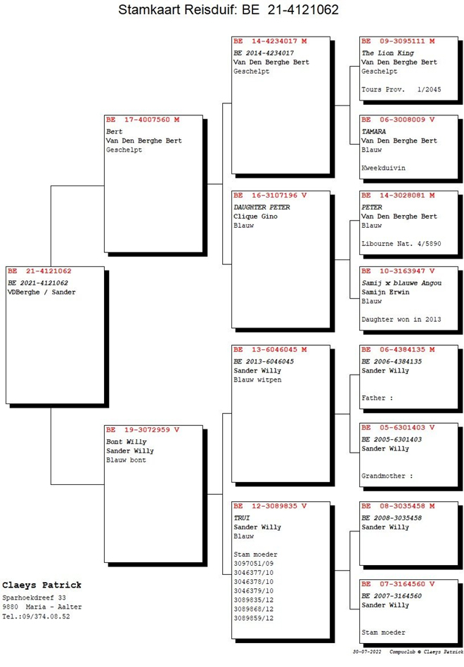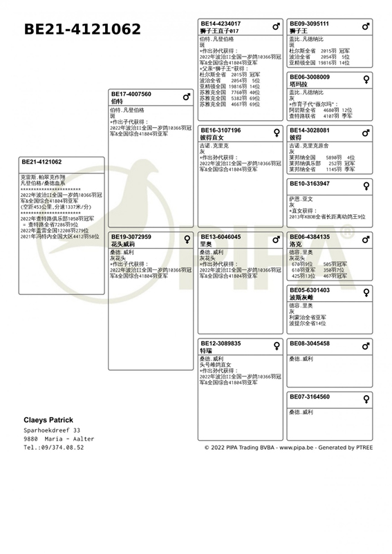 比利時一歲鴿10.366羽全國冠軍-克雷斯.帕翠克(Claeys Patrick)鴿舍,該舍 (Maria Aalter)冠軍鴿B21-4121062灰公是在7月30日(星期六)13時9分完成打鐘,空距為453.743公里,平均分速為1337.51米/分。